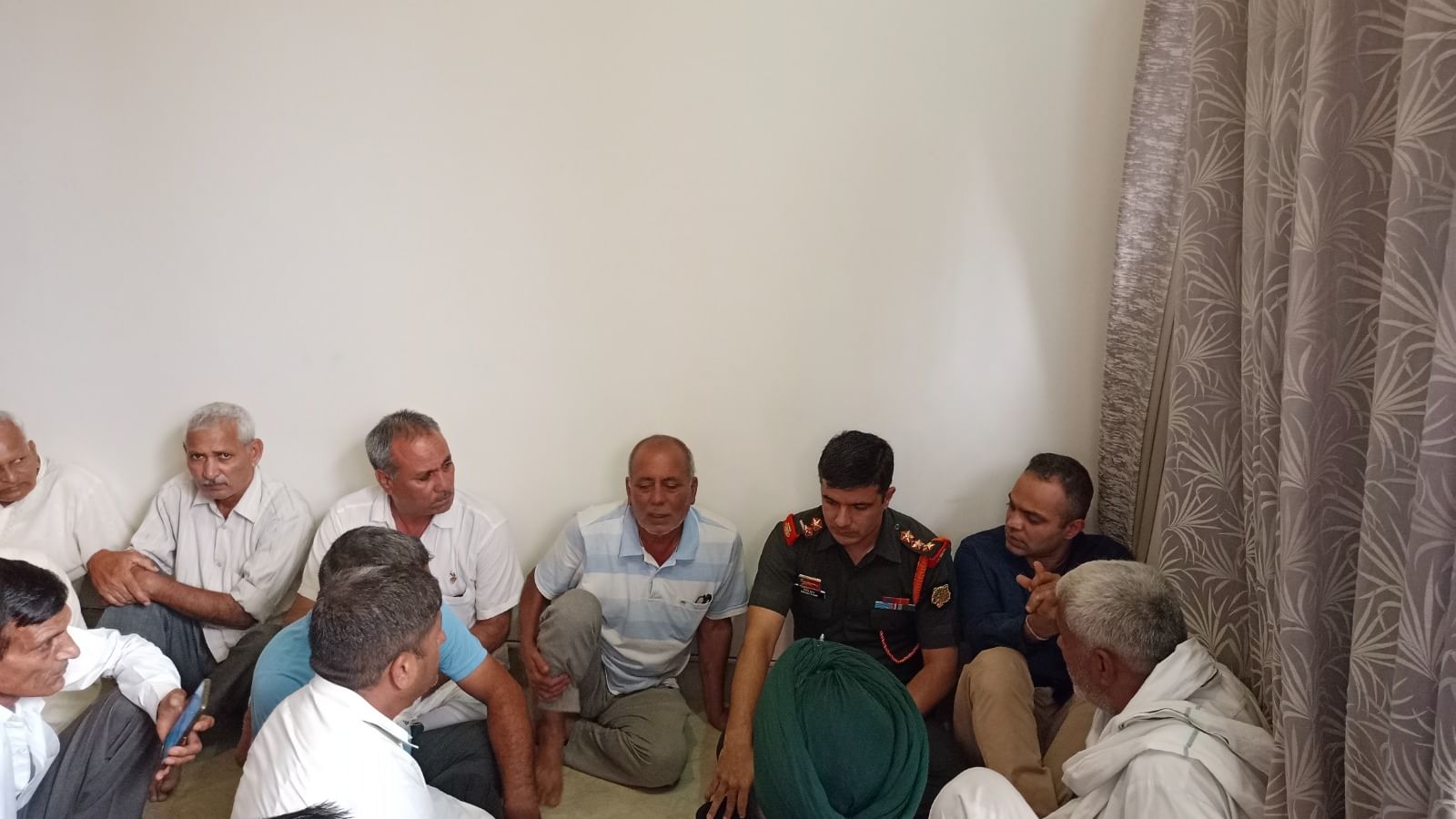 मेजर आशीष धौंचक के पिता लालचंद और चचेरे भाई मेजर विकास से बात करते कैप्टन संजीव कुमार।
