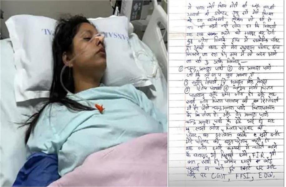 घटना गुरुवार शाम की है। जहां अपने शाहपुरा बी-सेक्टर स्थित घर में 31 वर्षीय पायल ने चूहे मारने वाली दवा खा ली। पायल की स्थिति गंभीर बनी हुई है। यह घटना भोपाल के चुनाभट्टी थाना क्षेत्र की है। हालांकि पायल ने जहर क्यों खाया और जान देने की कोशिश क्यों की इसके कारण अज्ञात है। फिलहाल पूरे मामले पर पुलिस का कहना है कि जांच चल रही है। पायल मोदी का कथित सुसाइड नोट सामने आ गया है। उन्होंने केंद्रीय मंत्री चिराग पासवान और 5 अन्य लोगों पर आरोप लगाए है। इनमें चन्द्र प्रकाश पाण्डे, वेद प्रकाश पाण्डे, सुनील त्रिपाठी, भगवान सिंह मेवाड़ा और हितेष पंजाबी के नाम शामिल हैं। कथित सुसाइड नोट के मुताबिक, चंद्र प्रकाश पाण्डे और चिराग पासवान आपस में जीजा-साले हैं। वहीं, वेद प्रकाश पाण्डे और चंद्र प्रकाश आपस में सगे भाई हैं। सुसाइड नोट में आरोप लगाया गया है कि उक्त सभी लोग चिराग पासवान की पॉलिटिकल पावर का इस्तेमाल कर मोदी की कंपनियों पर CGST, FFSI, EOW, ED के छापे डलवा रहे हैं।