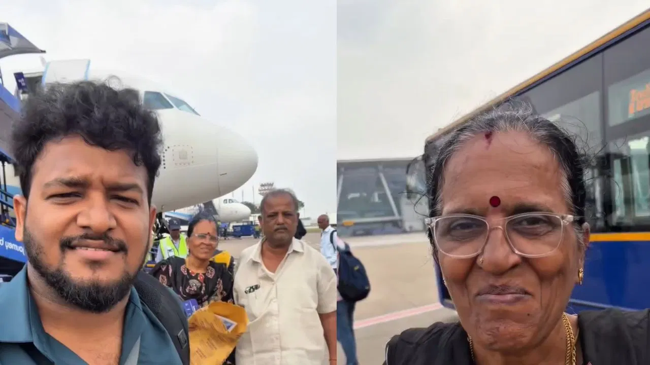 दरअसल, इस वीडियो में एक बंदा अपने माता-पिता को पहली बार हवाई जहाज का सफर कराता नजर आता है और उसके बाद उनका जो रिएक्शन होता है, वो देखने लायक होता है. वीडियो में आप देख सकते हैं कि बंदा कैसे अपने माता-पिता को उनकी पहली हवाई यात्रा पर ले जाते हुए नजर आता है. शुरुआत में बंदा अपने पैरेंट्स के साथ रनवे पर खड़ा होता है, जबकि उसके पीछे इंडिगो का विमान इंतजार कर रहा होता है. इस दौरान मां के चेहरे की खुशी देखने लायक होती है.