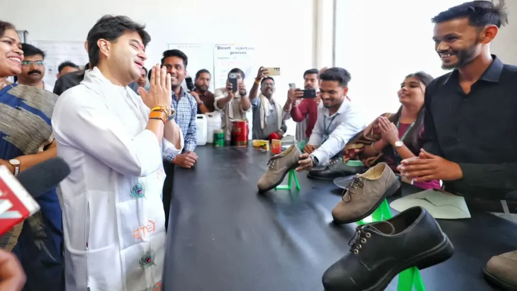 गुना/शुवपुरी: केंद्रीय मंत्री व स्थानीय सांसद ज्योतिरादित्य सिंधिया ने गुना के पास हरिपुर स्थित फुटवियर डिजाइन एवं डेवलपमेंट इंस्टीट्यूट पहुंचकर स्टूडेंट्स द्वारा बनाए फुटवियर के डिजायन ध्यान से देखी. ज्योतिरादित्य सिंधिया ने कहा “जब वह वर्ष 2007 में वाणिज्य एवं उद्योग राज्यमंत्री के रूप में अपनी जिम्मेदारी संभाल रहे थे, तब उन्होंने सोचा था कि एफडीडीआई जैसे इंस्टीट्यूट केवल महानगरों तक सीमित न रहें.”